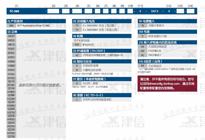 如FC360H1K5T4E20H2BXCDXXSXXXXALBX,代表380V,1.5KW,IP20,C3等級內置濾波器,內置制動,PROFINET現場總線