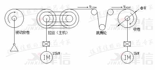 160型水箱拉絲機放卷為被動式放卷,主牽引為15kW交流異步電機,收卷用3kW交流異步電機,設計最高線速度為20米/秒。收卷為了與主機線速度同步并保持恒定張力,引入跳舞輪緩沖機構。由于跳舞輪上未安裝伺服氣缸,因此在正常運行過程中鋼絲的張力只與跳舞輪及其上配重塊的重量有關,而與跳舞輪的位置無關。