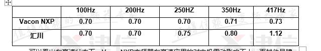 可以看出在高速狀態(tài)下,VaconNXP變頻器在高速應(yīng)用的對(duì)電機(jī)震動(dòng)影響不大,而其他品牌變頻器在高速應(yīng)用時(shí),會(huì)增加電機(jī)震動(dòng)。高速應(yīng)用在Vacon變頻器有完整的解決方案,NXP系列變頻器完全可以穩(wěn)定應(yīng)用在高速應(yīng)用的場(chǎng)合,同時(shí)有良好的應(yīng)用效果。