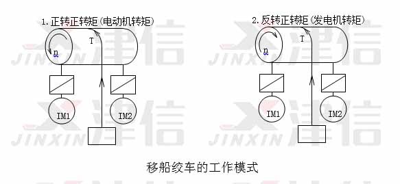 移船絞車是重要的海工設備,在海上工作平臺、鋪管船里有廣泛的應用。移船絞車的工況與起升相似,正轉(zhuǎn)時收線,變頻器工作于電動機模式,電機對負載作功;反轉(zhuǎn)時放線,變頻器工作于發(fā)電機機模式,負載對電機做功,要求變頻器內(nèi)置制動晶體管。與普通起升不同的是,移船絞車連續(xù)工作時間很長(數(shù)小時),所以對于變頻器的過載能力要求不高,但是要求變頻器具有100%制動轉(zhuǎn)矩連續(xù)運行的能力。