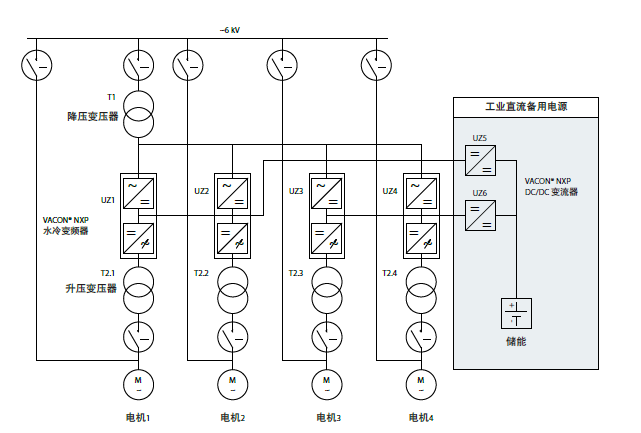 通過(guò)采用低壓水冷變頻器并結(jié)合“降壓-升壓”方案,來(lái)驅(qū)動(dòng)中壓電機(jī),IC-ART 和丹佛斯共同開(kāi)發(fā)的直流備用電源系統(tǒng)來(lái)保證主電晃電或故障時(shí)的可靠持續(xù)運(yùn)行。