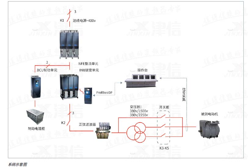 這個項目是Danfoss公司首次同天作電氣的合作項目;項目中采 用了以丹佛斯公司VACON® NX系列變頻器為電源核心的測試電源解決方案。單元+逆變單元+制動單元)、正弦濾波器、升壓變壓器、制動電阻以及輸出電壓切換開關構成。可以提供最高至2250V的正弦電壓輸出。天作電氣成柜。另外包含測試操作臺,以及為了滿足測試工藝而選用的各種傳感器,功率分析儀器等。