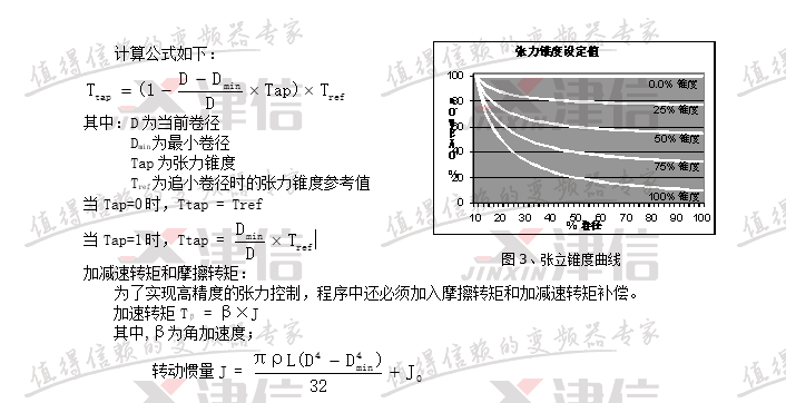 有了當前卷徑值,和張力錐度設定值,就能計算當前張力。張力與卷徑的關系如圖3所示,當張力錐度為0時,張力保持恒定不變,相當于恒張力控制;當張力錐度為100%時,卷徑每增大1倍,張力就下降一半,相當于恒轉矩控制。